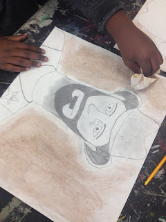 Next, came the sketching. I showed students how to make a face by estimating the size of their palm for scale. From their we added a hat, neck, bandana, shoulders, and all the details of the face and clothing. Students then used their sketch to transfer their self-portraits to a larger version. Once complete, we "aged" the paper by using diluted brown paint to either spray or smear across the paper. Students really enjoyed this process.